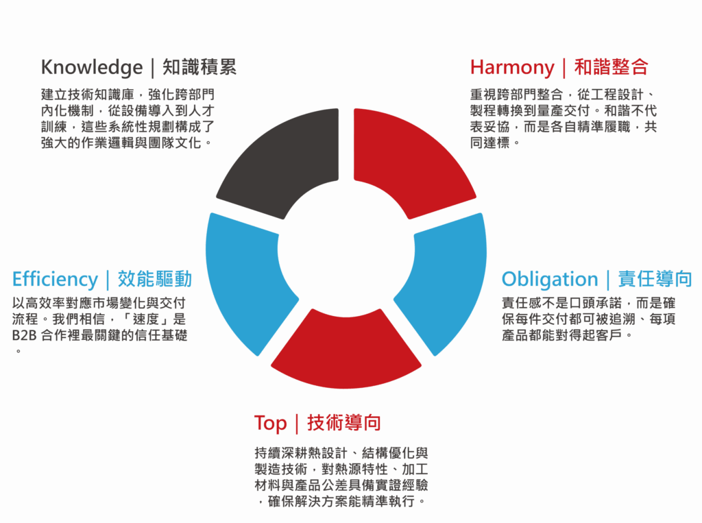 我們以技術架構為本,制度流程為主軸,橫跨研發、製造、業務三個層級的協作體系。研發部門負責前端規格制定、熱模擬分析與結構,製造單位掌握包括 精密加工、表面處理與模組組裝等關鍵製程,業務窗口統整訂單、交貨協調,以符合客戶產品規格、品質及交期要求為目標,提高客戶滿意度。